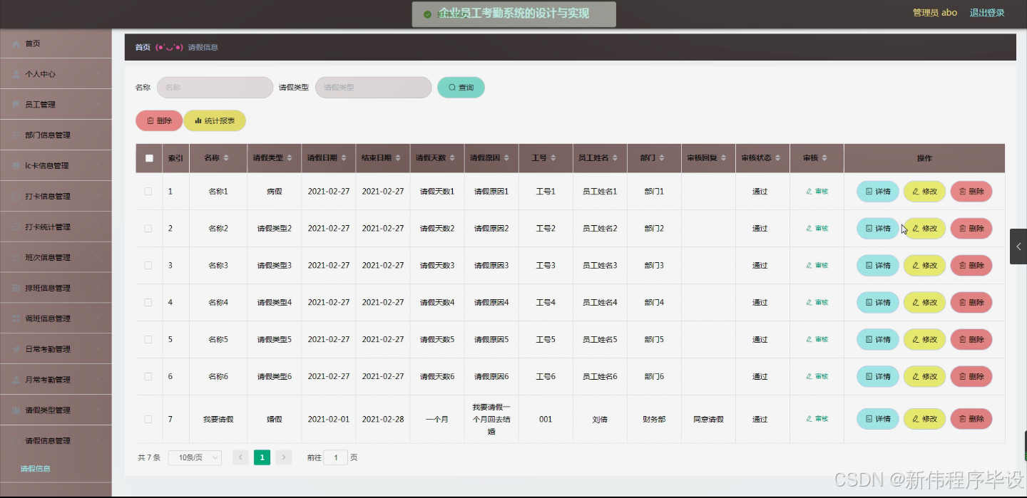 - 请假信息管理。对员工的请假类型(如病假、事假、年假等)和请假时间进行记录。系统要能够根据请假信息自动调整考勤统计结果,并且在员工请假审批流程方面可以进行一定的设置(如请假申请、审批等流程)。