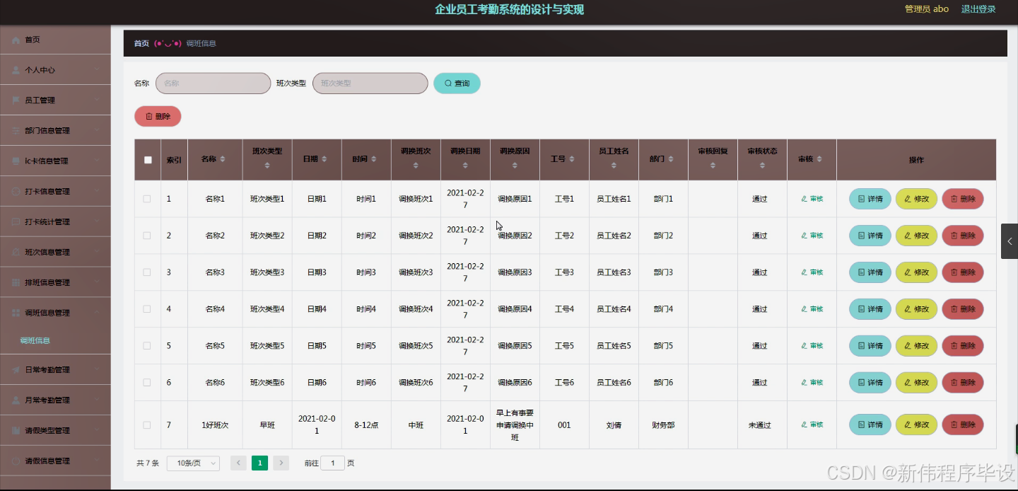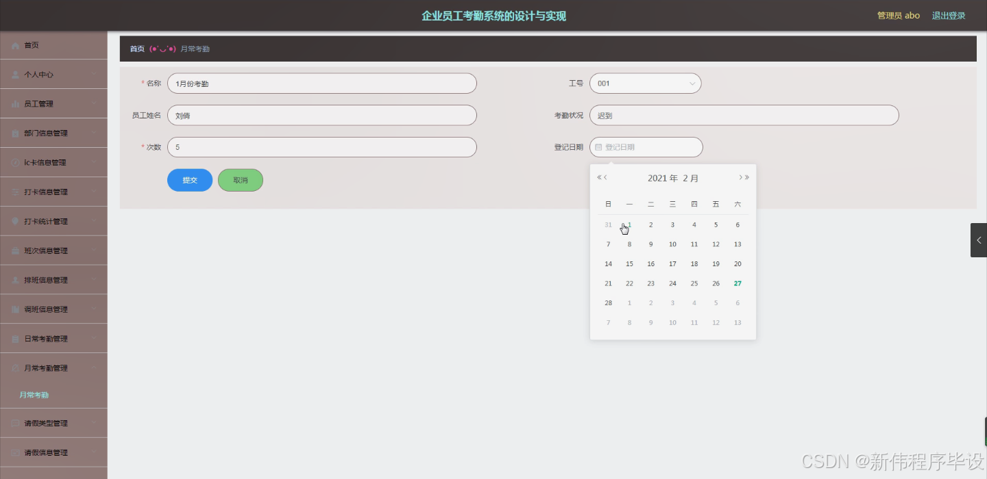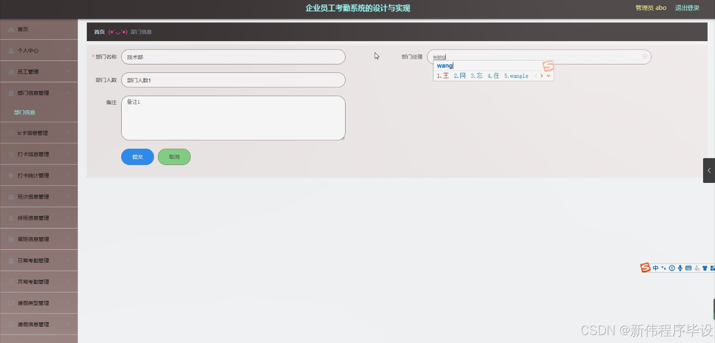 - 部门基本信息的维护。包括部门名称、部门负责人等信息的管理。部门信息在考勤管理中也起到重要作用,例如可以按照部门进行考勤统计和分析,了解各部门的考勤整体情况。