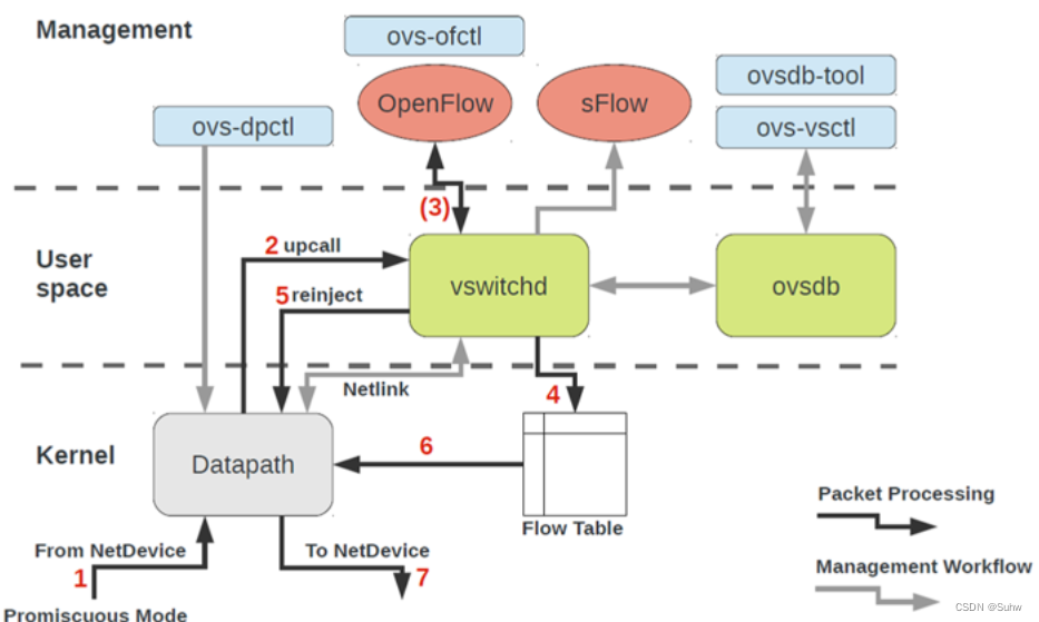 - openvswitch.ko 是 OVS 的内核模块,实现了 OVS 数据平面(Data Plane)和控制平面(Control Plane)之间的连接,其中还包含一个关键的部分就是datapath,通过 datapath 在内核层面完成数据包的转发、过滤和处理,以实现虚拟网络的各种功能。