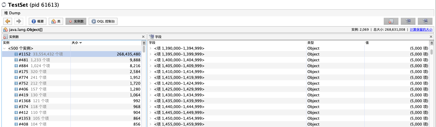 我们看到,在将1000w个Integer加载到内存后,内存占用主要是两种对象占用:Object[]和Integer,Integer就是我们要存储的实际元素,Object[]占了268,631,008,这是因为有一个长度为3355w的数组,其占用空间为 12 + 4 + 8 ∗ 33 , 554 , 432 = 268 , 435 , 472 b y t e 12 + 4 + 8 * 33,554,432 = 268,435,472byte 12+4+8∗33,554,432=268,435,472byte。和jvisuam上显示的差了8byte,目前不太清楚是哪里差的