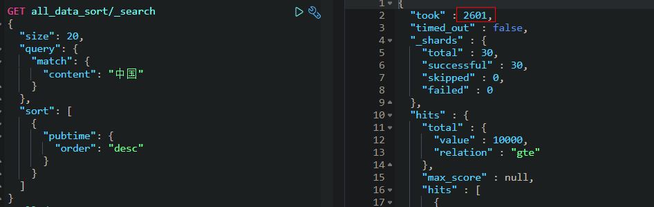 [2022-09-28 15:11:27.392] [main] INFO c.a.e.service.impl.TimeComparisonImpl - index_sort 前后测试对比, 搜索词 中国,查询时间对比 19208 vs 12345, 查询性能提升 35.729904%