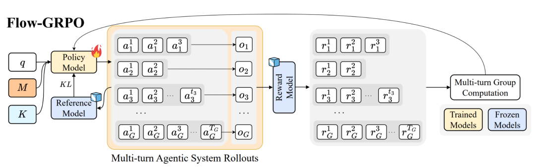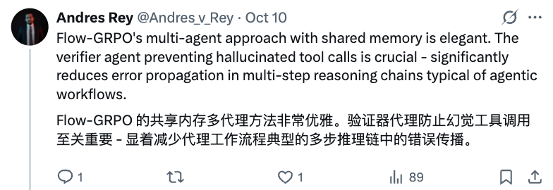Flow-GRPO采用共享内存的多智能体架构设计精妙。其中验证智能体对幻觉化工具调用的阻断机制尤为关键——它能显著减少智能体工作流中典型的多步推理链误差传播。