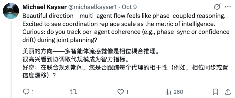 多智能体流*(multi-agent flow)给人的感觉就像“相位耦合推理”(phase-coupled reasoning)*。很期待看到“协同能力”取代“规模”,成为衡量智能的指标。
