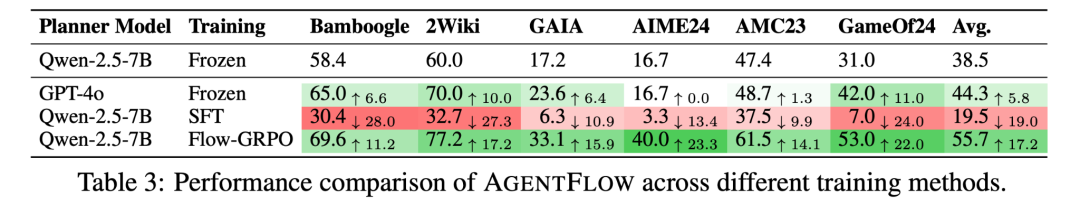 对比实验显示,若采用离线监督学习(SFT)方式训练规划器,性能反而显著下降,平均降低19%。