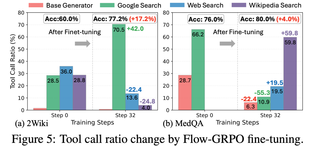 有意思的是,经过Flow-GRPO的强化训练规划器,系统学会了根据任务特点选择合适的工具组合;同时,经过训练的系统会自发探索出新的工具使用模式,比如组合使用维基百科搜索(Wikipedia Search)和特定网页增强搜索(Web Search)的连招,通过工具链获得更加深入地信息挖掘,而这些模式几乎没有在未训练的推理流中出现。