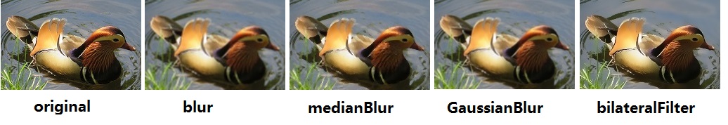 注意 1) 双边滤波相比以上三种滤波方法,其处理速度很慢,因此,一般建议取 d=5 用于实时图像处理,d=9 适合于非实时的图像领域