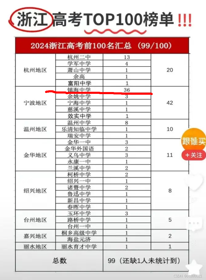下面是今年镇海中学前100名中,占有36席 。
