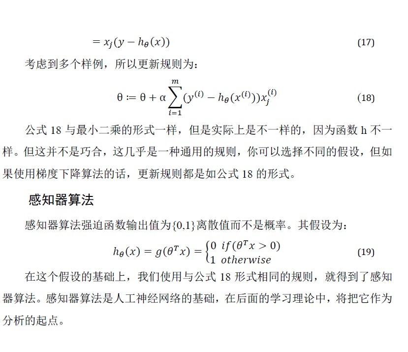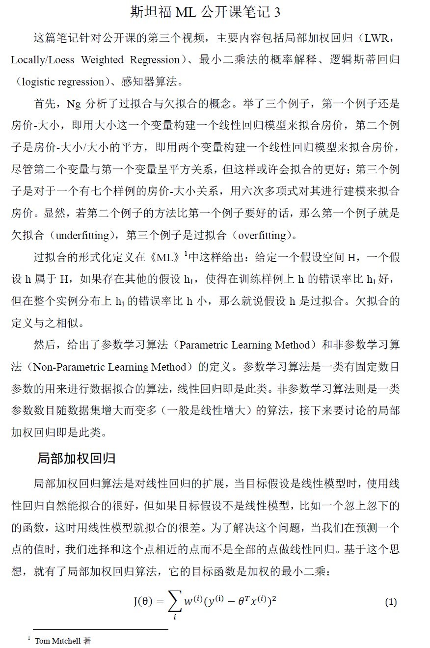 作者看Ng的机器学习公开课,每看完一个视频都会记录笔记。因在CSDN博客写公式不便,将笔记全做成图片上传。本文是第3个视频的笔记,主要内容有局部加权回归、最小二乘的概率解释、逻辑斯蒂回归、感知器算法。