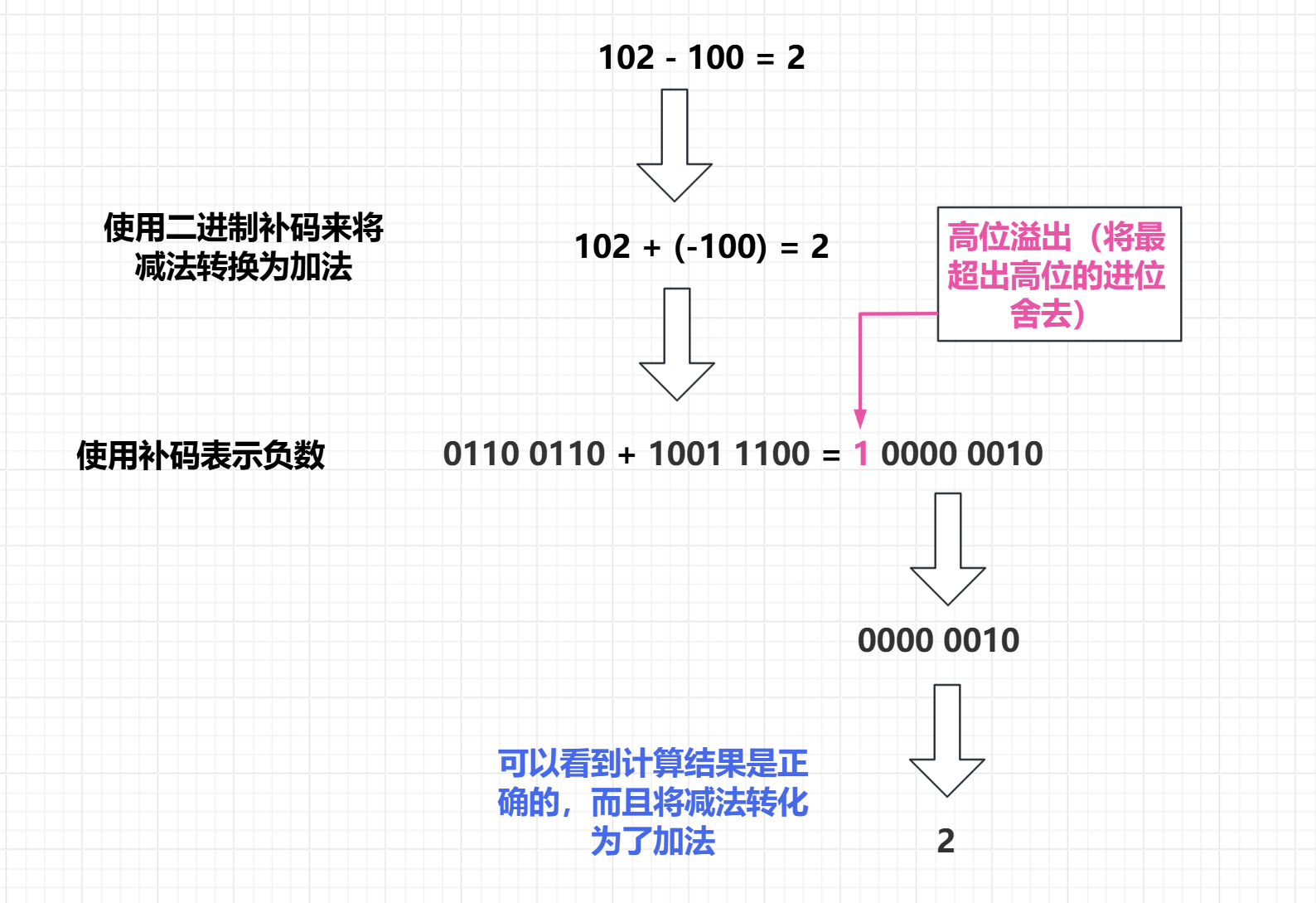 二进制补码的原理与上面的例子的原理是类似的,也是使用正数表示负数,然后将最高位进位舍去,为的就是让 CPU 加法单元可以计算减法,也可以说是将减法转换为加法。