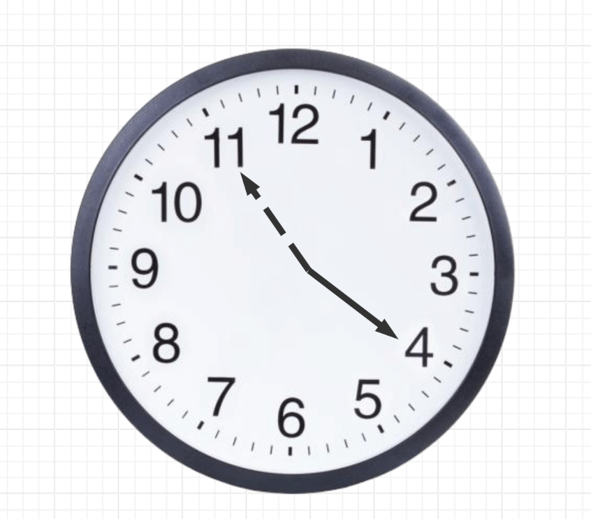 我们想要将时钟的时针从 4 点转到 11 点,有两种办法,一种是顺时针转动 7 小时,另一种是逆时针转 5 个小时,如果我们定义逆时针为负,则这两种办法就是: