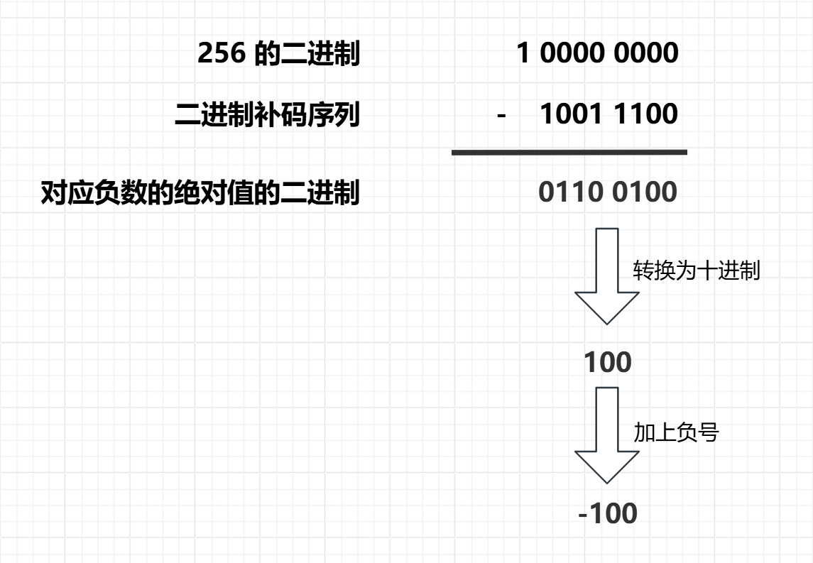 例如一个二进制补码是 1001 1100,其对应的十进制负数求法为: