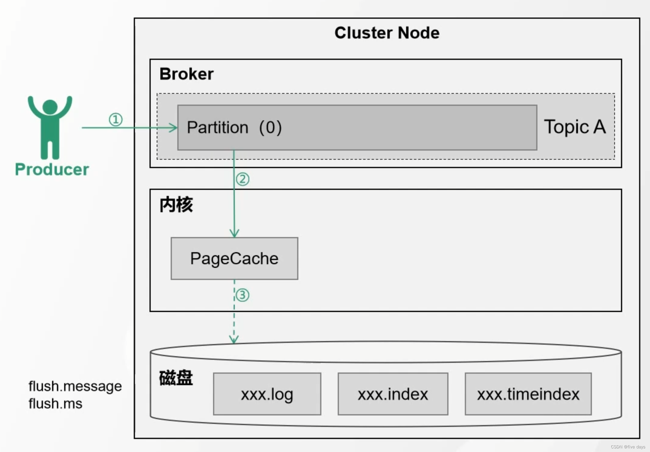 kafka的消费流程,首先是producer生产消息经过处理后放入到Broker服务器中,然后进入到内存中,内存再进行刷盘到磁盘中,kafak提供了两种刷盘策略,同步刷盘(flush.message 一次IO刷盘多少消息)和异步刷盘(flush.ms多长时间刷盘一次)
