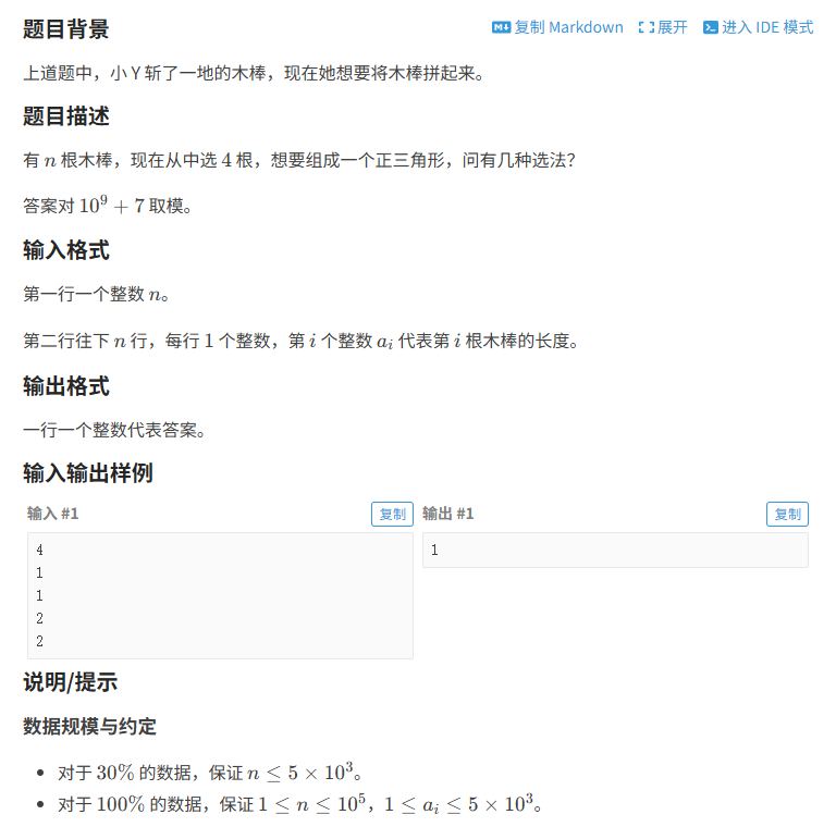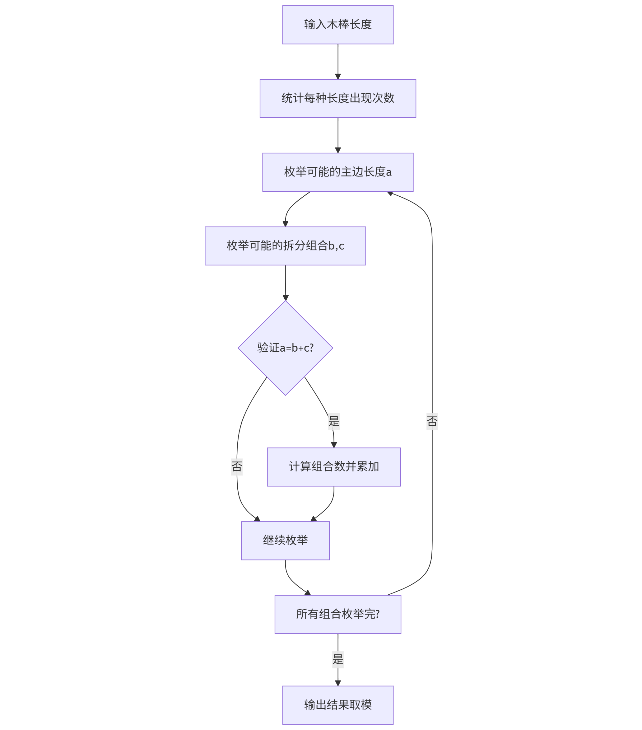 这是典型的组合计数优化问题,在CSP-J/S竞赛中考查选手的组合数学思维和算法优化能力。题目要求统计能用4根木棒拼成正三角形的方案数,需要巧妙的数学建模。