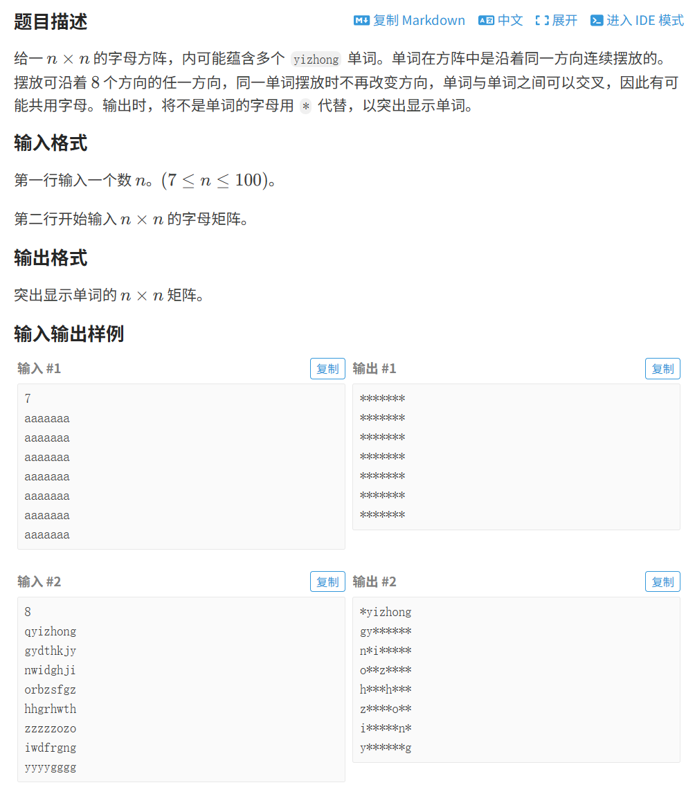 给定一个n×n的字母方阵,需要找出其中所有隐藏的"yizhong"单词。这些单词在方阵中沿着八个方向(上、下、左、右、左上、右上、左下、右下)连续摆放,且同一单词方向不变。单词之间可以交叉共用字母。最终输出时,将不属于任何"yizhong"单词的字母用*代替。