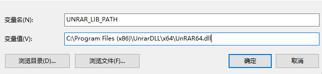 解压后,根据操作系统的位置,配置环境变量。进入 UnrarDLL 文件夹,可以看到文件夹下有一个 UnRAR.dll 文件,在文件夹下有一个 x64 文件夹,里面放的是 64 位的文件。根据操作系统的版本,配置一个名为 UNRAR_LIB_PATH 的环境变量:
