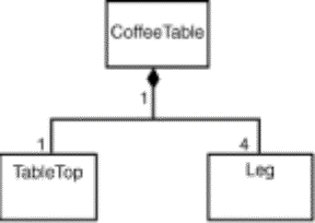 典型组合关系的例子是桌子,下图表示的就是桌子类(Coffee Table),它包括桌面类(Table Top)和桌腿类(Leg),桌面和桌腿只能从属于桌子而不会从属于其他,当桌子不存在时,桌面和桌腿也就没有意义了,也就是说三个类处于一个生存周期。
