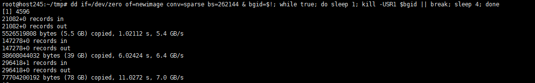 dd if=/path/to/bigimage of=/path/to/newimage conv=sparse bs=262144 & bgid=$!; while true; do sleep 1; kill -USR1 $bgid || break; sleep 4; done