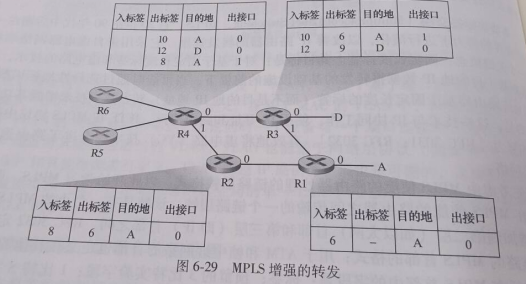 对于上图中的外围设备(R5、R6、A、D),它们可以通过一个MPLS基础设施连接在一起,这与交换局域网与ATM网络能够将IP设备连接到一起的方式十分相似。并且与交换局域网或ATM网络相似,MPLS使能路由器在完成转发的工作时,并不直接接触分组的IP首部,只使用MPLS首部