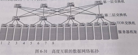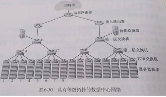 对于几万或几十万主机:数据中心通常由应用路由器和交换机等级结构(hierarchy of router and switch)。在该等级结构的顶端,边界路由器与接入路由器相连,每台接入路由器与一台第一层交换机相连,每台第一层交换机与多台第二层交换机以及一台负载均衡器相连。每台第二层交换机又通过机架的TOR交换机(第三层交换机)与多个机架相连。所有链路通常使用以太网作为链路层和物理层协议,并混合使用铜缆和光缆