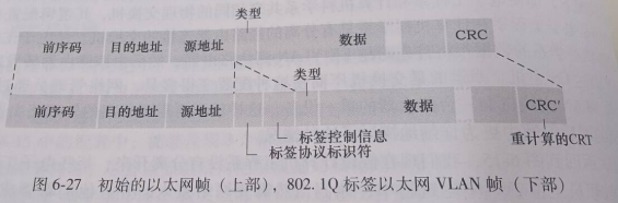 该帧由标准的以太网帧加入首部的4字节的VLAN标签组成,VLAN标签承载这该帧所属的VLAN的标识符,解析后会被VLAN干线的接收端交换机删除。VLAN标签包含一个2字节的标签协议标识符(TPID)字段和一个2进制的标签控制信息字段和一个3比特的优先权字段。
