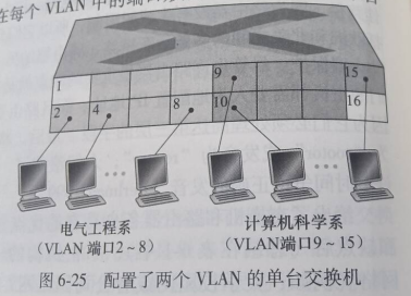 如下图,一个具有16个端口的交换机,其中1、16端口未分配,2-8端口被划分至电气工程系(EE)的VLAN,9-15端口被划分为计算机科学系(CS)的VLAN。