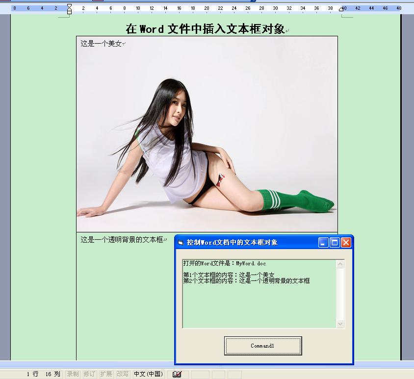 - ActiveDocument.Shapes(1).TextFrame.TextRange.Text = "这是一个美女" '给文本框赋值