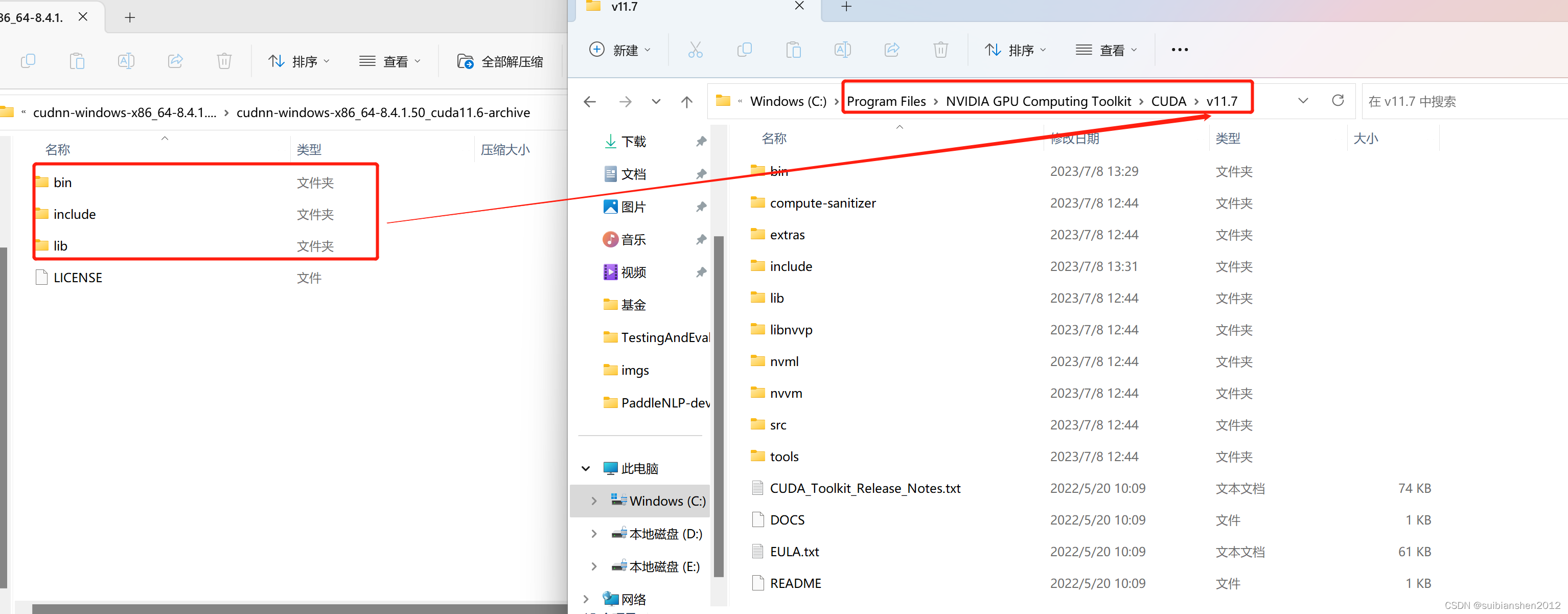 下载完成后,然后解压该文件,将其复制到CUDA的对应的v11.7文件下,有重复的直接替换。