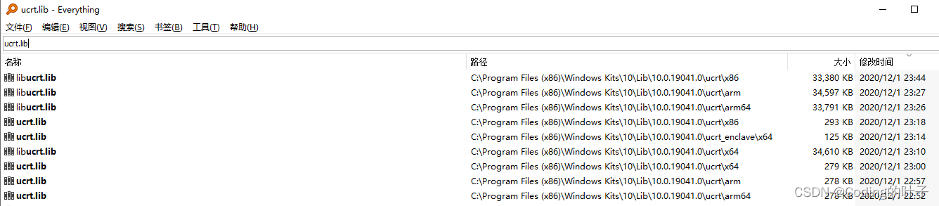 出现该错误,表示编译环境没有找到“ucrt.lib”。 对于出现xxx.lib无法找到的情况,我们需要创建或更新LIB环境变量,增加xxx.lib所在文件夹路径。我们用1.1节中Everything工具搜索ucrt.lib,发现其存在于文件夹“C:\Program Files (x86)\Windows Kits\10\Lib\SDK版本\ucrt\x64”,也可以是x64、x86、arm、arm64,根据需要进行选择。如果没有对应的SDK版本文件夹,那么回到1.2节采用isual Studio Installer安装Windows 10 SDK。