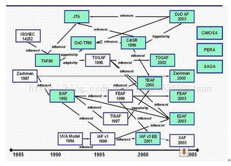 源于90年代美国的企业架构框架,到目前已经衍生出多种企业架构框架,如DoDAF(美国国防部体系架构框架The Department of Defense Architecture Framework)、TOGAF等。