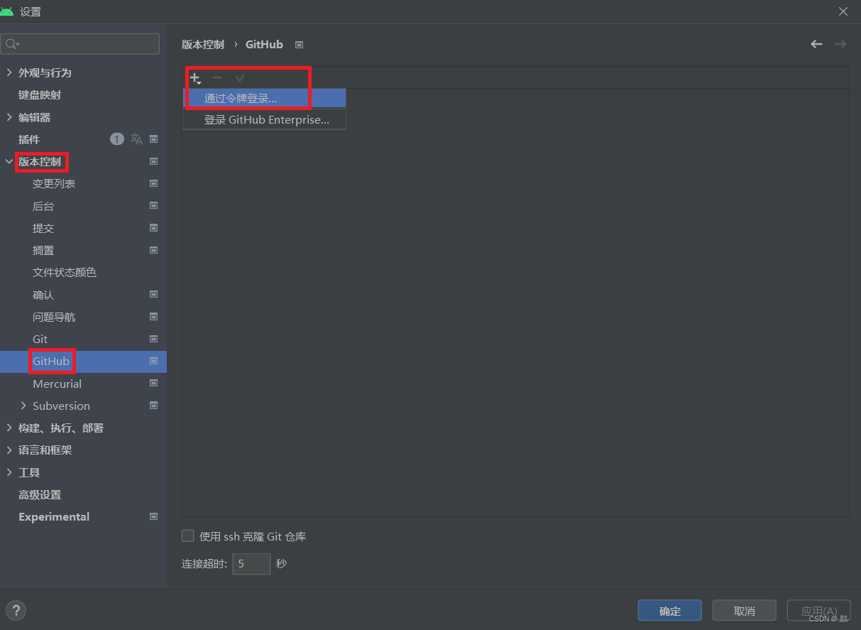 (1)在设置中找到GitHub(就在刚刚找的Git的下面),点击左上角的加号,点击通过令牌登录。