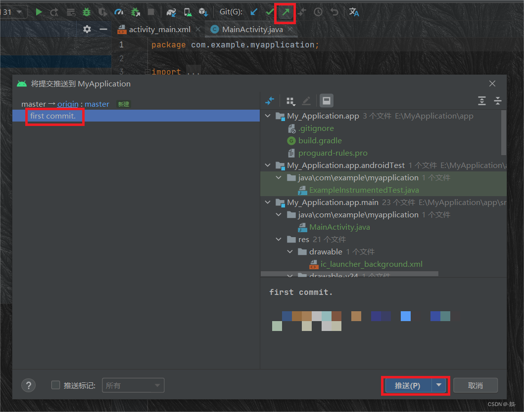 (3)点击共享后,Android Studio 下方会显示正在共享,等 Android Studio 提交完毕后。选择Push(推送,即绿色向上的小箭头),选择推送的版本,点击推送。