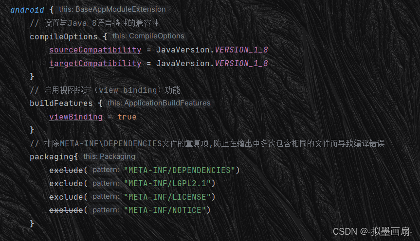 // 排除META-INF\DEPENDENCIES文件的重复项,防止在输出中多次包含相同的文件而导致编译错误