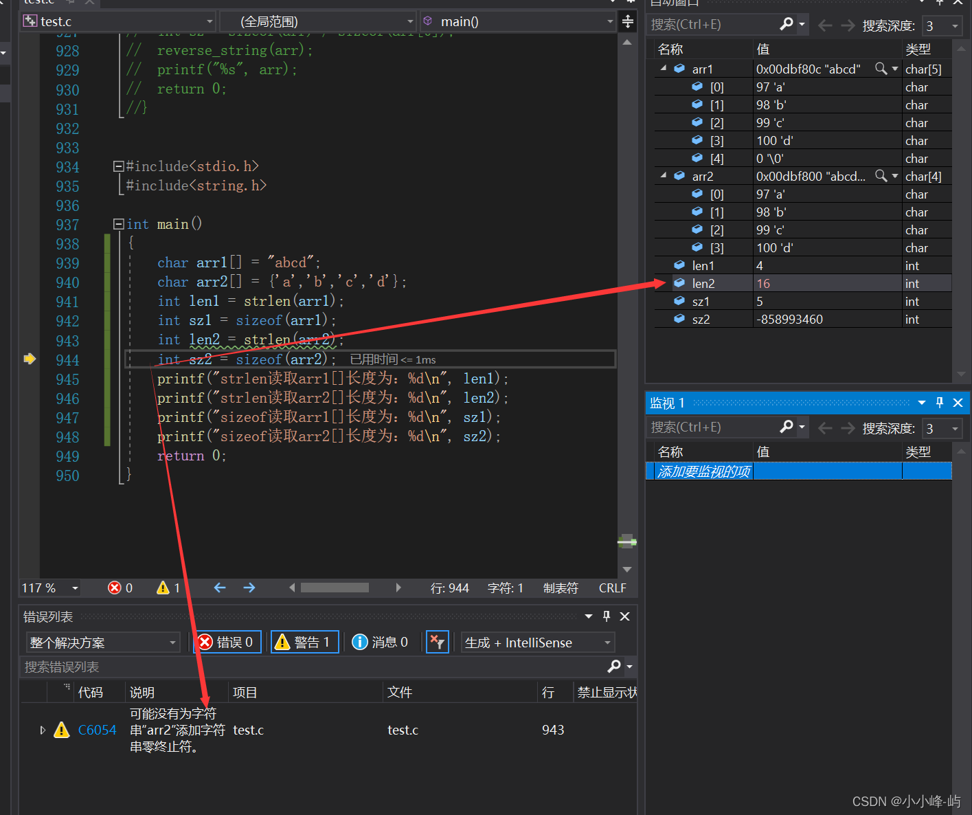 这里可以清晰的看到警告是由于arr2[]数组没有添加终止符造成。"strlen"函数找不到终止符'\0',即造成了函数读取到了随机值。