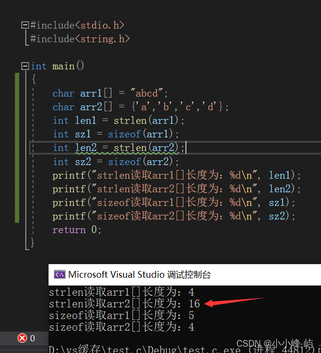这里可以看到"strlen"函数读取的arr2[]数组是有问题的,那么造成这样的原因是什么呢?