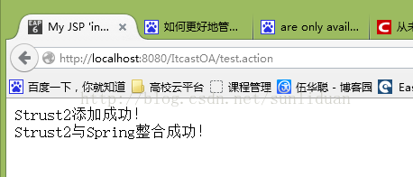通过在浏览器地址栏直接访问action:http://localhost:8080/ItcastOA/test.action,我们可看到浏览器的成功页面:
