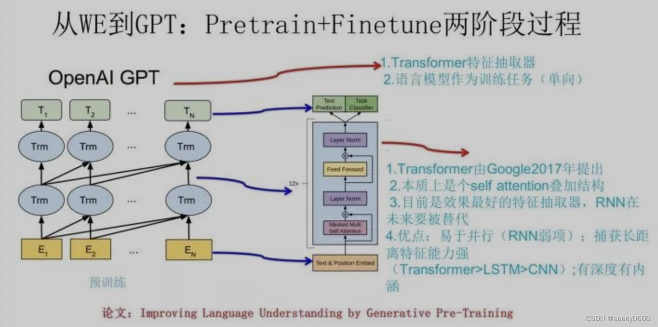 Transformer结构应用于语言模型中,关于Transformer的介绍可以参考 Transformer在CV领域的应用,其优势是提取长依赖特征更好,且并行效率更高。GPT的结构如下: