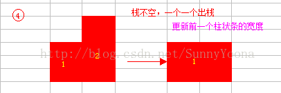 (4)如果最后栈不空,只剩高度递增的柱状条。一个一个出栈,更新最大矩形面积。每一个柱状条出栈都要更新前一个柱状条的宽度。如图4