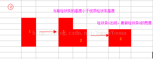 (2)当入栈柱状条的高度小于栈顶柱状条的高度时,柱状条出栈,同时计算出栈的柱状条的面积,更新最大矩形面积。同时更新当前柱状条的宽度。如图2
