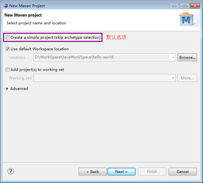 在弹出的New Maven Project对话框中,使用默认的选项。不要选择Create a simple project。然后,点击Next按钮。