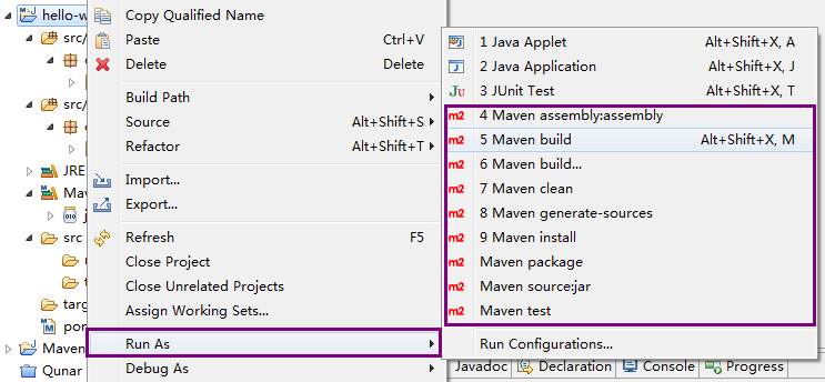 在Maven项目或者pom.xml上右击,再点击弹出的快捷菜单选择Run as,就能看到常见的Maven命令。