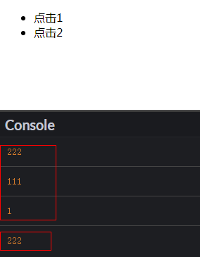 点击1时,由于该时间节点也添加了监听函数,所以输出结果有三个。
