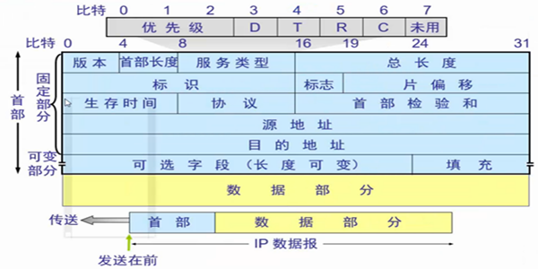 (9)协议(8bit)字段指出此数据报所携带上层数据使用的TCP协议还是UDP协议,以便对等层接收到数据报交给上层相应的协议(TCP或者UDP协议)进行处理;