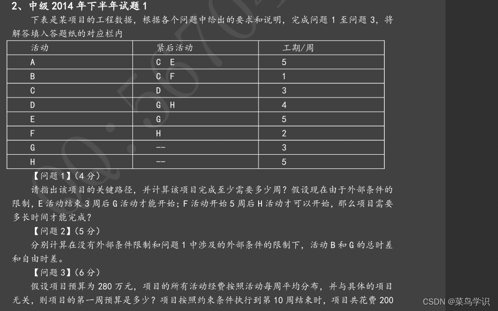 (2)双代号时标网络图。此外,还有横道图、甘特图、单代号网络图等可以表示进度(3)A总时差 3,自由时差 2:D总时差 0,自由时差 0:F总时差 7,自由时差 7(4)C工作有1周总时差,所以拖延1周对项目总体进度没有影响。