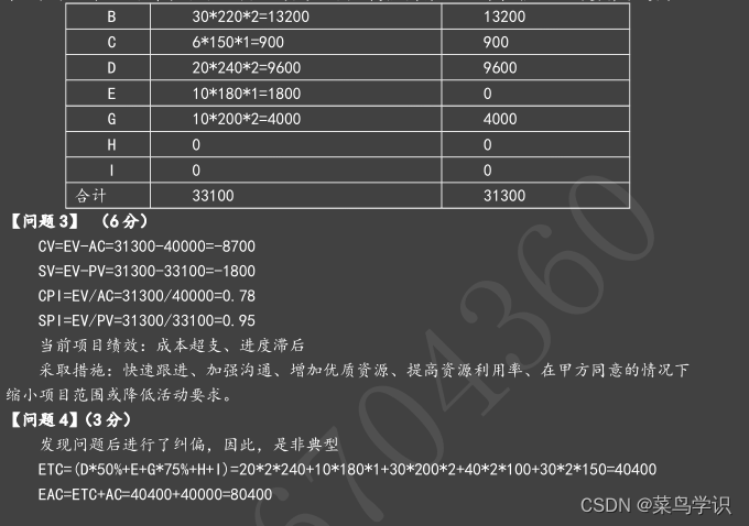 1)非典型偏差EAC=ETC+AC=BAC-EV+AC=30000-19000+25000=36000