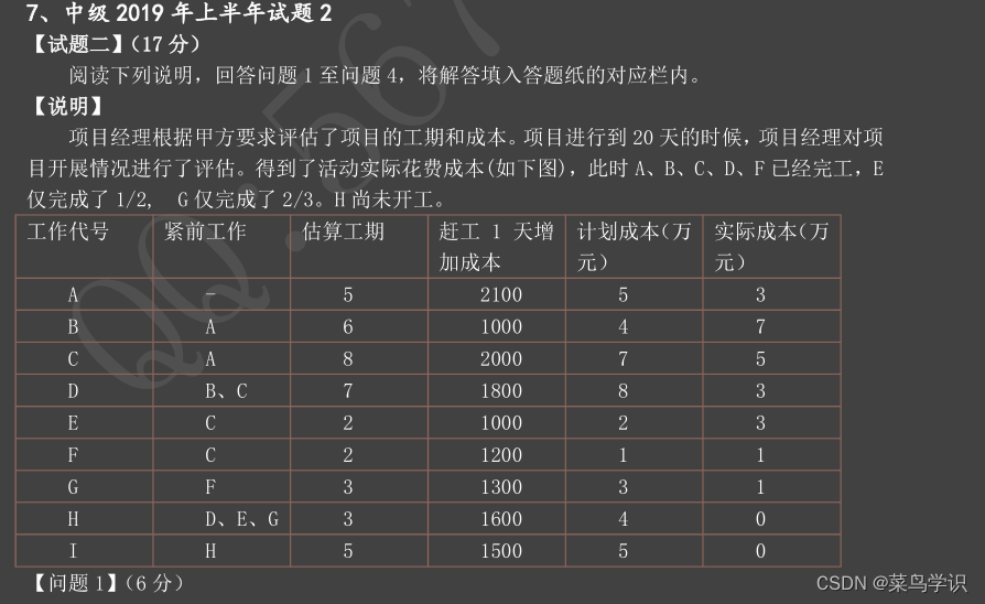 第6周时,计划完成了需求调研1天,系统实施5天,即PV=1.8+35.2*5/8=23.8万实际:需求调研结束+系统实施了一半,EV=1.8+35.2*50%=19.4 AC=1.8+17=18.8万SV=EV-PV=19.4-23.8=-4.4,进度落后 CV=EV-AC=19.4-18.8=0.6,成本节余