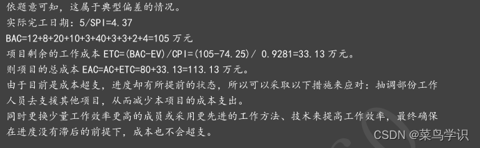 因为监控点的 CPI、SPI都小于 1,所以项目进度落后,成本超支,改进措施: