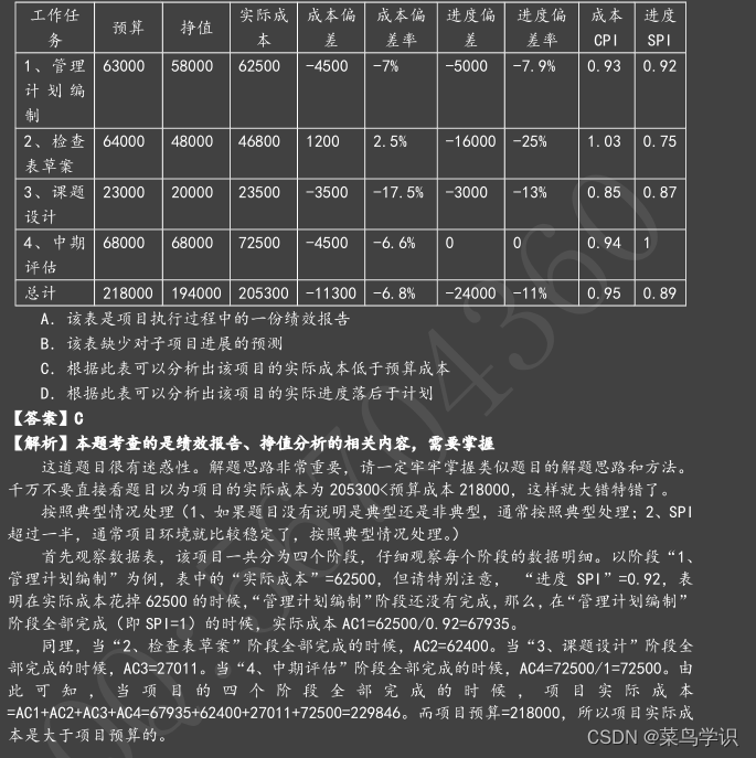 A.CPI>1,SPI>1 B.CPI<1,SPI<1 C.CPI>1,SP|<1 D.CPI<1,SPI>1