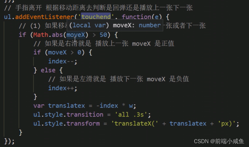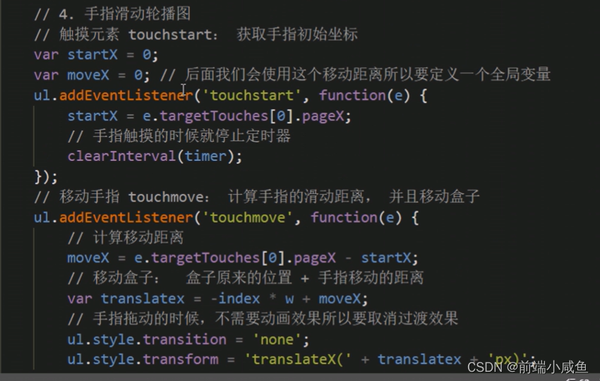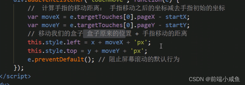 3、移动端拖动原理:手指移动中,计算出手指移动的距离。然后用盒子原来的位置 + 手指移动的距离