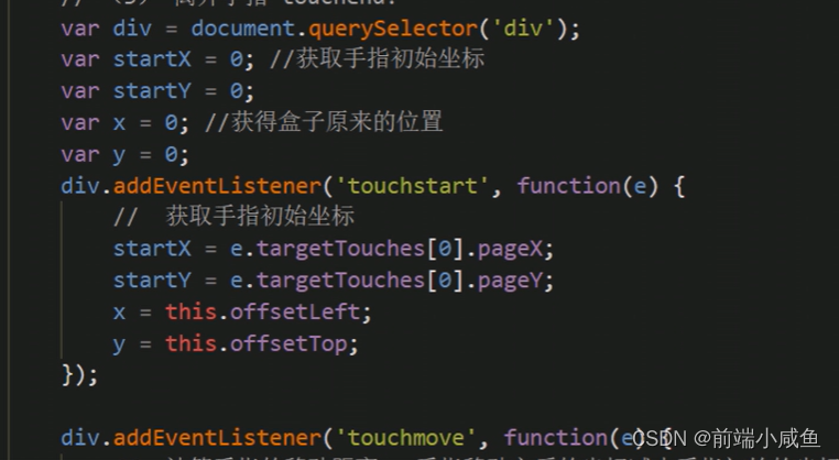 2、但是拖动元素需要当前手指的坐标值 我们可以使用 targetTouches【0】 里面的pageX和pageY