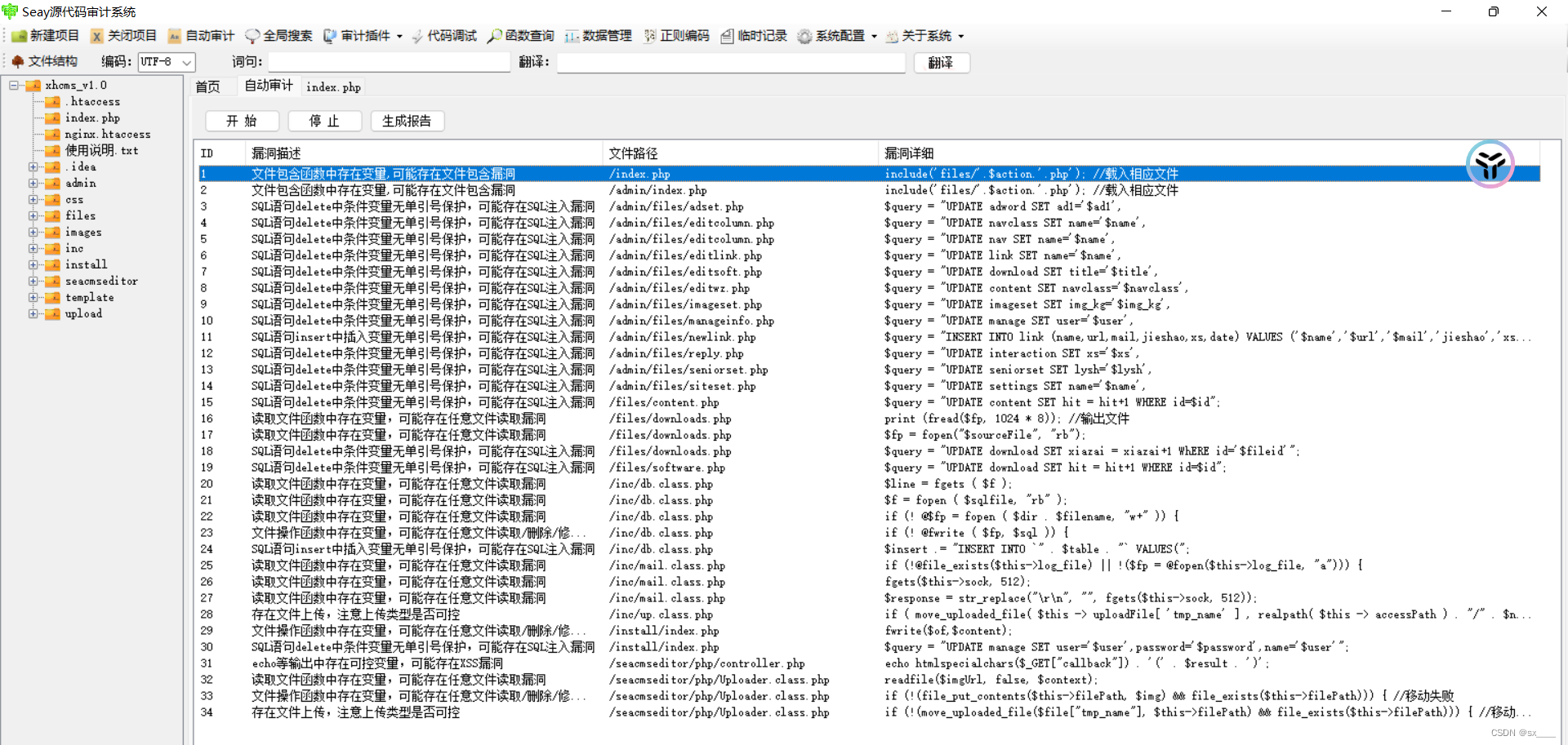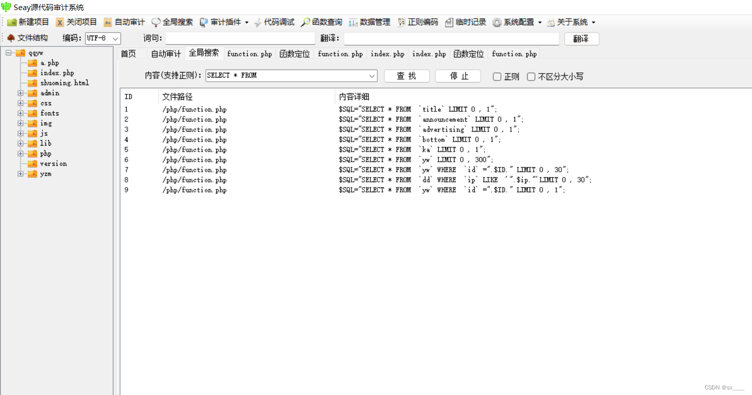 代码审计-淡然qqyw图标点亮系统 (5)所以可以抓包,在数据包中修改server中的值,根据第三步中找到的定向语句,在server头中构造闭合sql语句,从而进行sql注入。(2)确定第8条语句为sql注入语句,打开第8条语句,发现函数ywdd,且函数ywdd参数为&ip。(3)全局搜索ywdd函数,发现调用了ywdd函数的语句的实参是另一个getip函数。(4)跟踪getip函数,发现是从数据包server头中提取值进行赋值。4.打开seay源码审计系统进行审计(针对于sql漏洞)2.在php搭建网站。